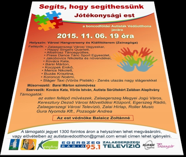 Szeretettel hívjuk az Autista Sérültekért Zalában Alapítvány szervezésében a boncodföldei autista gyermekek javára megrendezendő jótékonysági gálára 2015. április 25. (szombat) 19 órára a Keresztury Dezső VMK Kamaratermébe. (Zalaegerszeg, Landorhegyi út 21.) |