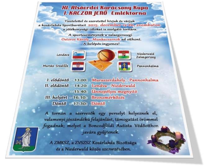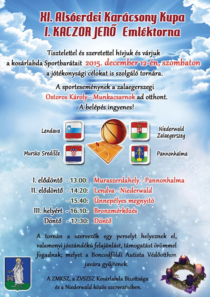 A gyűjtés az Autisták Védőotthona javára történik. Köszönjük a felajánlást a szervezőknek, a részt vevőknek és minden támogatónak. XI. Alsóerdei Karácsony Kupa I. KACZOR JENŐ Emléktorna 2015. december 6. (péntek) 13 órától Helyszín: a zalaegerszegi Ostoros Károly Munkacsarnok (Október 6. tér 16.) |